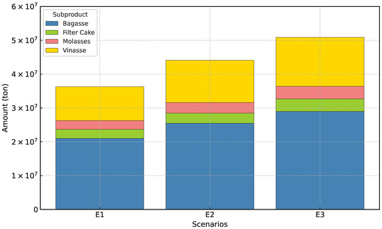 Finally, molasses, which is a by-product of the sugar crystallization phase, is usually found in the range of 3–5% of processed cane. ISO norms and industrial studies in various countries support values between 3% and 4.45% [59,60,61,62]. Some reports extend up to 5%, particularly when final centrifugation stages are considered [63]. These reports serve as the basis for validating the model statistically in terms of estimating the bio-products for this research.
