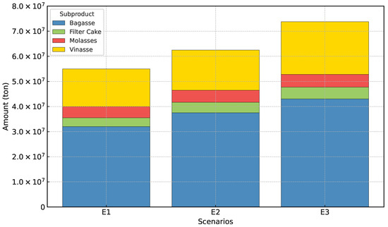 A wide range of by-products derived from sugarcane processing have been reported in the literature, with bagasse being the most prominently studied. Bagasse typically represents 17–30% of sugarcane mass, depending on the moisture content and production conditions. Global and national estimates report values such as 17–18% [47], 26% in Brazil for the 2013–2014 harvest [48], and up to 28–30% for fresh mass in Thailand and India [49,50]. Dry mass estimates range between 10% and 28%, with 13.5% to 16.2% frequently cited for dry bagasse [34,51,52]. Technical assessments and modeling studies confirm similar values, supporting the reliability of bagasse as a consistent by-product [53].