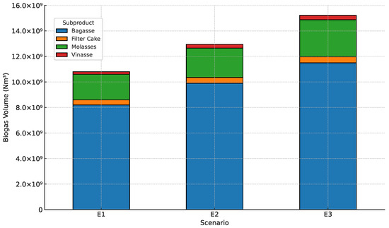 The following Equations (5) and (8) describe the calculation of the total biogas production from each by-product, based on the mass of the substrate and its specific biogas yield. The total biogas production is then obtained as the sum of the contributions from each individual by-product (9). These equations are useful for estimating the energy potential of sugar mills that implement anaerobic digestion processes as part of their waste management strategy. Additionally, they provide insights into the optimization of biogas production by identifying the most significant contributing substrates.
