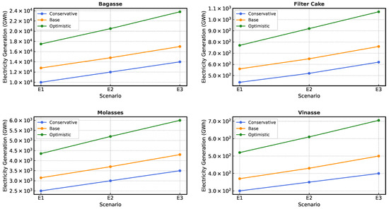 The total biogas production from sugar mills is obtained by summing the contributions from bagasse, vinasse, filter cake, and molasses. This comprehensive Equation (9) provides a holistic view of the biogas generation potential, supporting sustainable waste management and energy recovery in the sugar industry.