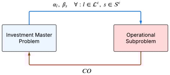 The operational subproblem receives investment decisions from the investment master problem, specifically the integer investment variables for transmission lines () and energy storage devices (). Transmission lines and storage devices with positive investment values ( or ) are incorporated into the sets of existing transmission lines () and storage systems ().