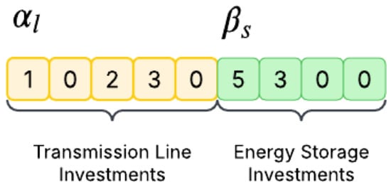Each chromosome (individual) consists of two independent segments: one for transmission line investments and another for storage system investments. Figure 2 illustrates a chromosome representation for a fictitious system with five candidate branches for transmission expansion and four candidate buses for the installation of energy storage. In this example, the chromosome specifies the construction of one transmission line on the first candidate branch, two lines on the third, and three lines on the fourth. Similarly, it indicates investments in five storage units at the first candidate bus and three at the second.