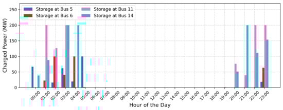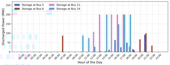 Energy storage investments are considered at buses 5, 6, 8, 10, 11, and 14, following []. Each bus can accommodate up to five storage units, with each unit having a power capacity of 100 MW and an energy capacity of 500 MWh. The subsidized costs are set at USD 500.0/kW (power) and USD 20.0/kWh (energy), as used in []. The charging and discharge efficiencies of the energy storage device are 95%. Investment costs are annualized using an interest rate 5%, with assumed lifetimes of 60 years for transmission lines [,] and 20 years for storage devices []. The maximum number of energy storage devices that can be invested at each bus is five.