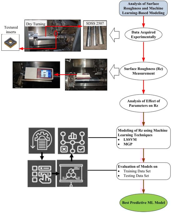 One of the most critical aspects of turning, and machining in general, is the surface roughness of the finished product, which directly influences the performance, functionality, and longevity of machined components. The accurate prediction of surface roughness is vital for enhancing component quality and machining efficiency. This study presents a machine learning-driven framework for modeling mean roughness depth (Rz) during the dry machining of super duplex stainless steel (SDSS 2507). SDSS 2507 is known for its exceptional mechanical strength and corrosion resistance, but it poses significant challenges in machinability. To address this, this study employs flank-face textured cutting tools to enhance machining performance. Experiments were designed using the L27 orthogonal array with three continuous factors, cutting speed, feed rate, and depth of cut, and one categorical factor, tool texture type (dimple, groove, and wave), along with surface roughness as an output parameter. Gaussian Data Augmentation (GDA) was employed to enrich data variability and strengthen model generalization, resulting in the improved predictive performance of the machine learning models. MATLAB R2021a was employed for preprocessing, the normalization of datasets, and model development. Two models, Least-Squares Support Vector Machine (LSSVM) and Multi-Gene Genetic Programming (MGGP), were trained and evaluated on various statistical metrics. The results showed that both LSSVM and MGGP models learned well from the training data and accurately predicted Rz on the testing data, demonstrating their reliability and strong performance. Of the two models, LSSVM demonstrated superior performance, achieving a training accuracy of 98.14%, a coefficient of determination (R2) of 0.9959, and a root mean squared error (RMSE) of 0.1528. It also maintained strong generalization on the testing data, with 94.36% accuracy and 0.9391 R2 and 0.6730 RMSE values. The high predictive accuracy of the LSSVM model highlights its potential for identifying optimal machining parameters and integrating into intelligent process control systems to enhance surface quality and efficiency in the complex machining of materials like SDSS.