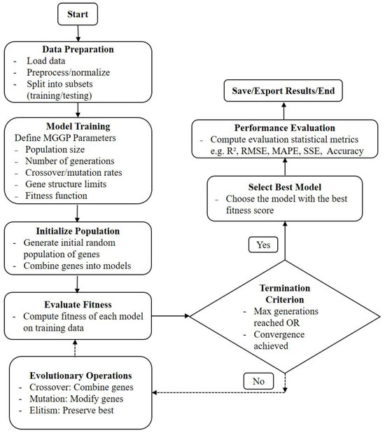 In MGGP, each gene is an individual expression tree evolved using the principles of standard GP, such as selection, crossover, and mutation. The overall model output is formed by linearly combining the outputs of multiple genes, with an additional bias term. Mathematically, the MGGP model can be expressed as shown in Equation (4) [23]: