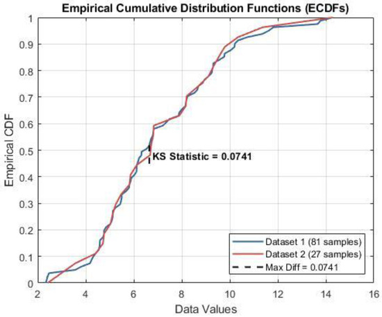 The test evaluates the maximum vertical distance referred to as the K-S statistic between the empirical cumulative distribution functions (ECDFs) of the two datasets. This metric quantifies the largest discrepancy between the distributions. Under the null hypothesis that both samples originate from the same underlying distribution, the p-value indicates the probability of observing such a difference by chance. The ECDFs of the Rz datasets (n = 27 and n = 81) are shown in Figure 5, visually illustrating the close alignment between the two distributions.
