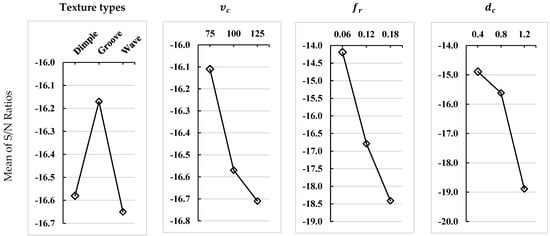 A Taguchi-based signal-to-noise (S/N) ratio analysis was employed to evaluate the influence of machining parameters, namely, cutting speed, feed rate, cutting depth, and tool texture type, on the surface roughness of the machined components. The S/N ratio quantifies the consistency of a response relative to the target value, with higher ratios signifying reduced variability and enhanced performance. The selection of the appropriate S/N ratio formulation depends on the nature of the response being examined and the experimental objectives. Common formulations include “larger is better,” which prioritizes maximization, “nominal is best,” which emphasizes precision around a target value, and “smaller is better,” which aims to minimize undesirable deviations [14].