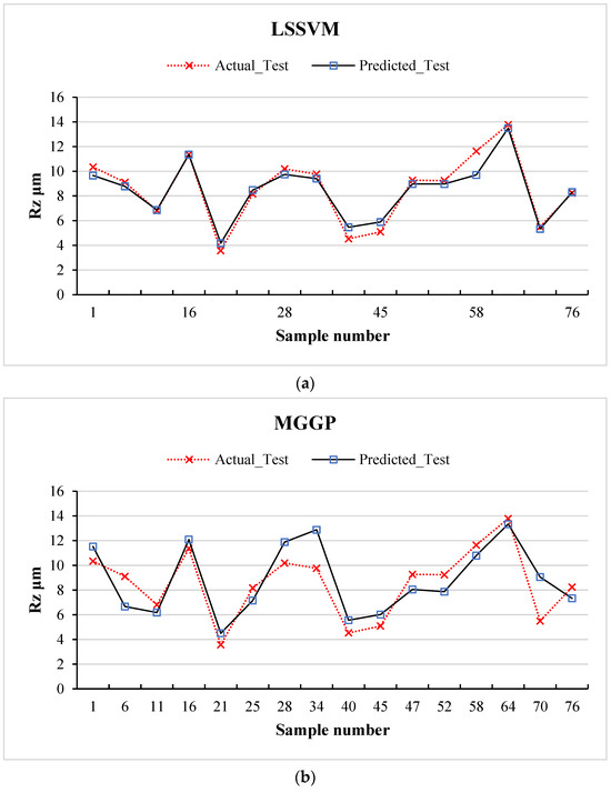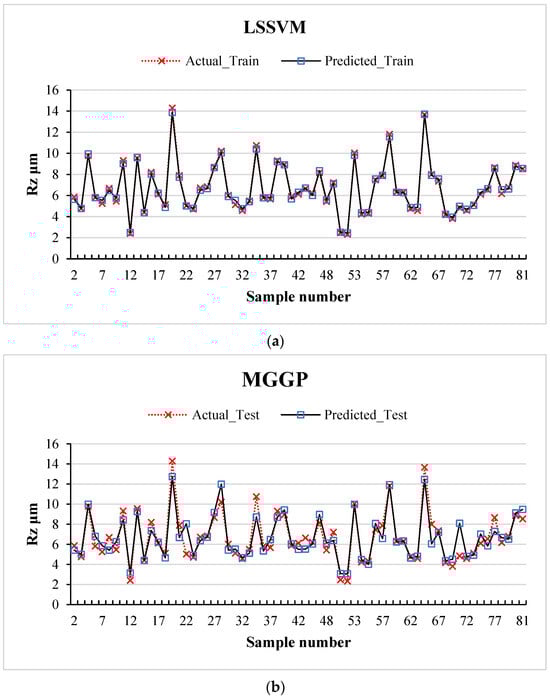 As depicted in Figure 7, the predicted Rz values demonstrate strong alignment with the actual values across both models: Least-Squares Support Vector Machine (LSSVM) and Multi-Gene Genetic Programming (MGGP). The close correspondence between the predicted and actual values underscores the ability of each model to effectively capture the underlying nonlinear relationships within the training data. This outcome highlights the high learning accuracy and robustness of the models during the training phase.