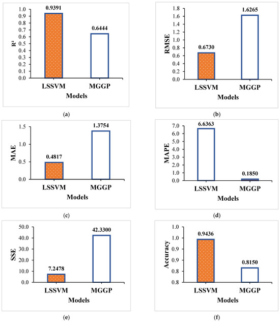 The prediction accuracy for both models was notably high, with LSSVM achieving accuracies around 95%, while MGGP achieved 82%. These results highlight the strong predictive capabilities of both LSSVM and MGGP models, particularly in handling unseen data. Figure 10 provides a comparative overview of the models’ performance on the testing dataset, as evaluated through key statistical metrics.