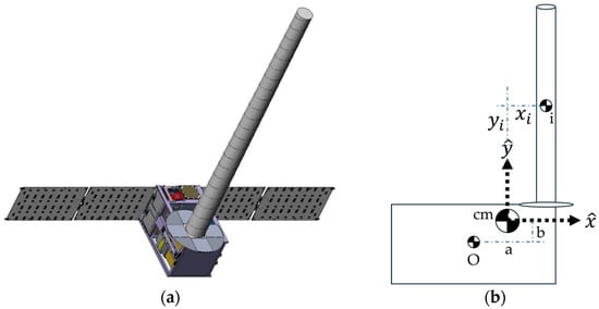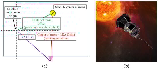 (a) Center of mass correction concept from [,] for satellites with laser retroreflector arrays (LRA). (b) U.S. Navy GEOSAT spacecraft []. Image credit: NASA. Used in accordance with image use policy [].