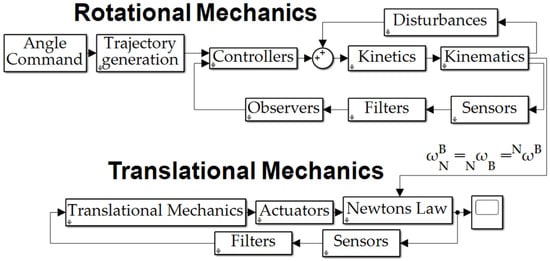 Top level topology of spacecraft guidance and control. More detailed elaboration of modeling and simulation may be found in [,].