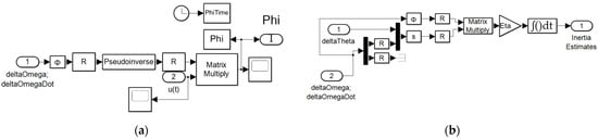 Inertia matrix component identification schemes. (a) Learning feedback inertia matrix estimator elaborated in Equation (21) []; (b) nonlinear adaptive inertia estimation scheme in accordance with Equation (17).