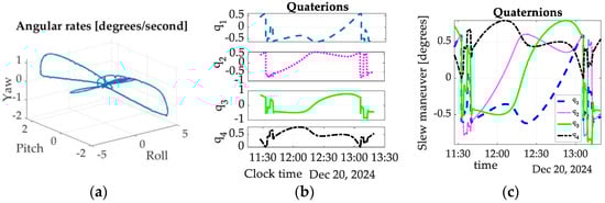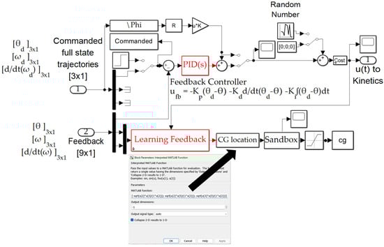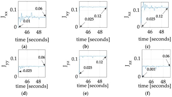 As reminded by Equation (22), following the analysis, modeling and simulation preface experimental validating spaceflight tests. Figure 5 contains a top level topology of spacecraft guidance and control, where this study focuses exclusively on the rotational mechanics subsystems. This topology is provided by the very simulation used to verify the analysis. Within the subsystem labeled “Controllers”, novel subsystems are created to estimate and to learn the inertia components (displayed in Figure 6), while the mass center location is simulated in the attitude control system displayed in Figure 7, where nomenclature is conveniently defined in Table 5.