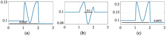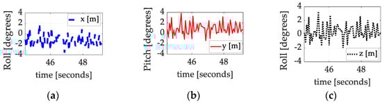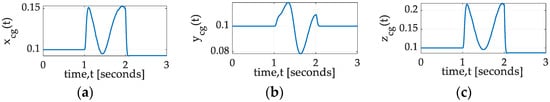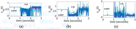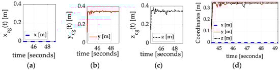 The derivation embodied in Equations (2)–(10) reveals time-varying mass distribution, where and, similarly, the coordinates of differential masses: . Utilizing the time-varying nature necessitates some parameterization of the location of the mass center and some method of discerning the time-varying values of the inertia matrix. Next, in Section 2.2, the center of mass location is parameterized by assuming that the actual location is potentially (likely) unknown and not at the center of the body coordinate system. The parallel axis theorem is used to solve the three-dimensional coordinates of the mass center location. Afterwards, Section 2.3 introduces one option for inertia matrix component estimation.