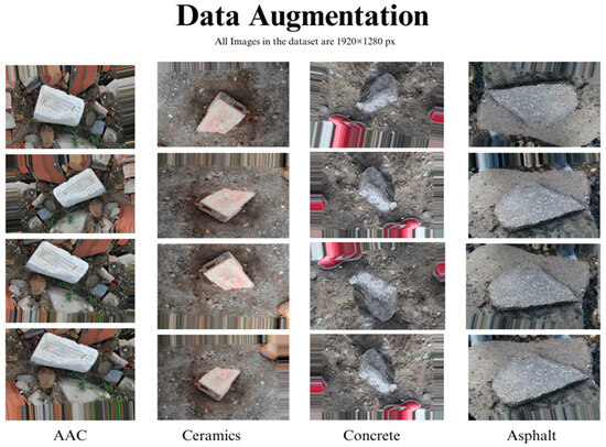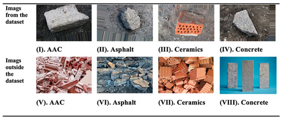 52]. The dataset originally contained 2664 images of materials fragments (AAC, asphalt, concrete, and ceramics). The images were captured at a CDW collection and sorting yard using a Canon DSLR camera, positioned at a distance of approximately 70 cm, producing images at a resolution of 1920 × 1280 px. To ensure consistent image quality and minimize variations in illumination, the researchers captured images in shade. CDW fragments were used without any cleaning to reflect the actual situations in the real world. Images were taken by the authors by placing fragments directly on the CDW piles or the ground while taking the images.