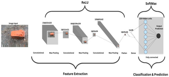 CNNs were chosen as the core architecture for the proposed model due to their efficiency in image classification tasks, especially with texture-rich visual data such as CDW. The datasets used in this study contained images of different types of materials exhibiting distinct patterns, textures, and edges. Due to their convolutional layers, CNNs are specifically designed to detect spatial hierarchies, as they progressively learn local and global features.