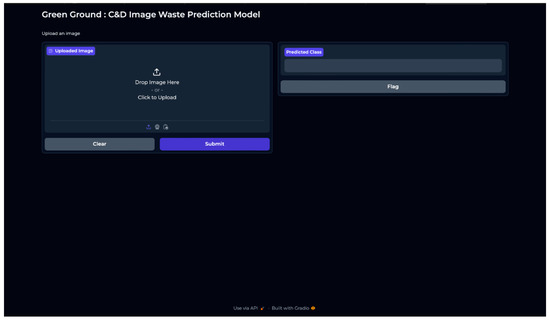 Figure 4 to provide an understanding of its structure and design. Uploading and dragging an image to the “Uploaded Image” box provides the user with the opportunity to test the model’s ability to predict and classify CDW materials. Once the user clicks on the “Submit” button, the image is sent to the models for testing. The predicted class is then displayed in the “Predicted Class” box. In the event that the “Flag” button is clicked, a file entitled “Flagged” appears on the user’s computer, which is intended for flagging specific images that have been selected by the user. In the case of the “Clear” button, it removes the current images to allow the user to test new images.