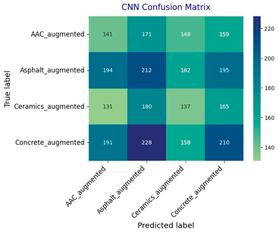 Table 9 presents precision, recall, F1-score, and support for each class. Across all categories, the F1-scores ranged from 0.22 to 0.28, showing a consistent distribution of performance. Accordingly, the concrete class achieved a precision of 0.29, a recall of 0.27, and an F1-score of 0.28, indicating moderate yet stable classification performance. According to these metrics, no single class disproportionately influenced overall accuracy, and the model maintained similar behavior across all material types.