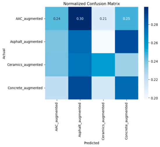 Figure 8 present the confusion matrix and its normalized counterpart, offering a detailed view of the model’s class-wise prediction behavior. The normalized confusion matrices revealed a relatively balanced performance across the four classes, with the proportion of correctly classified samples ranging between 21% and 30%. Approximately 24% of AAC samples were accurately predicted, whereas 30% were misclassified as asphalt. Similarly, the concrete class showed a 25% correct classification rate with a moderate degree of misclassification in the other classes. The patterns suggest that certain material types have overlapping visual characteristics, which may have contributed to the uncertainty associated with prediction.