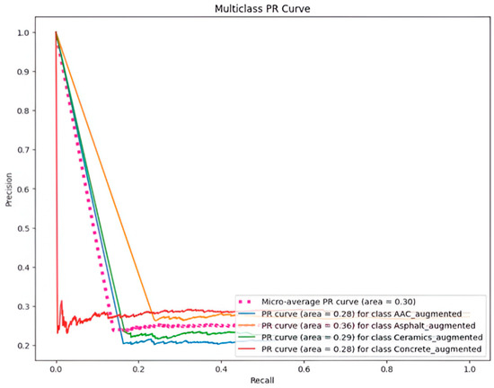 In-depth analysis of true positives (TPs) and false negatives (FNs) provided further insights into the model’s performance strengths and weaknesses. For instance, while the model correctly identified 210 true positives for concrete, it also had 577 false negatives, indicating areas for improvement. The multiclass precision–recall (PR) curve analysis offered a comprehensive view of the model’s precision and recall dynamics across all classes, aiding in visualizing performance discrepancies and guiding adjustments for enhanced predictive accuracy.