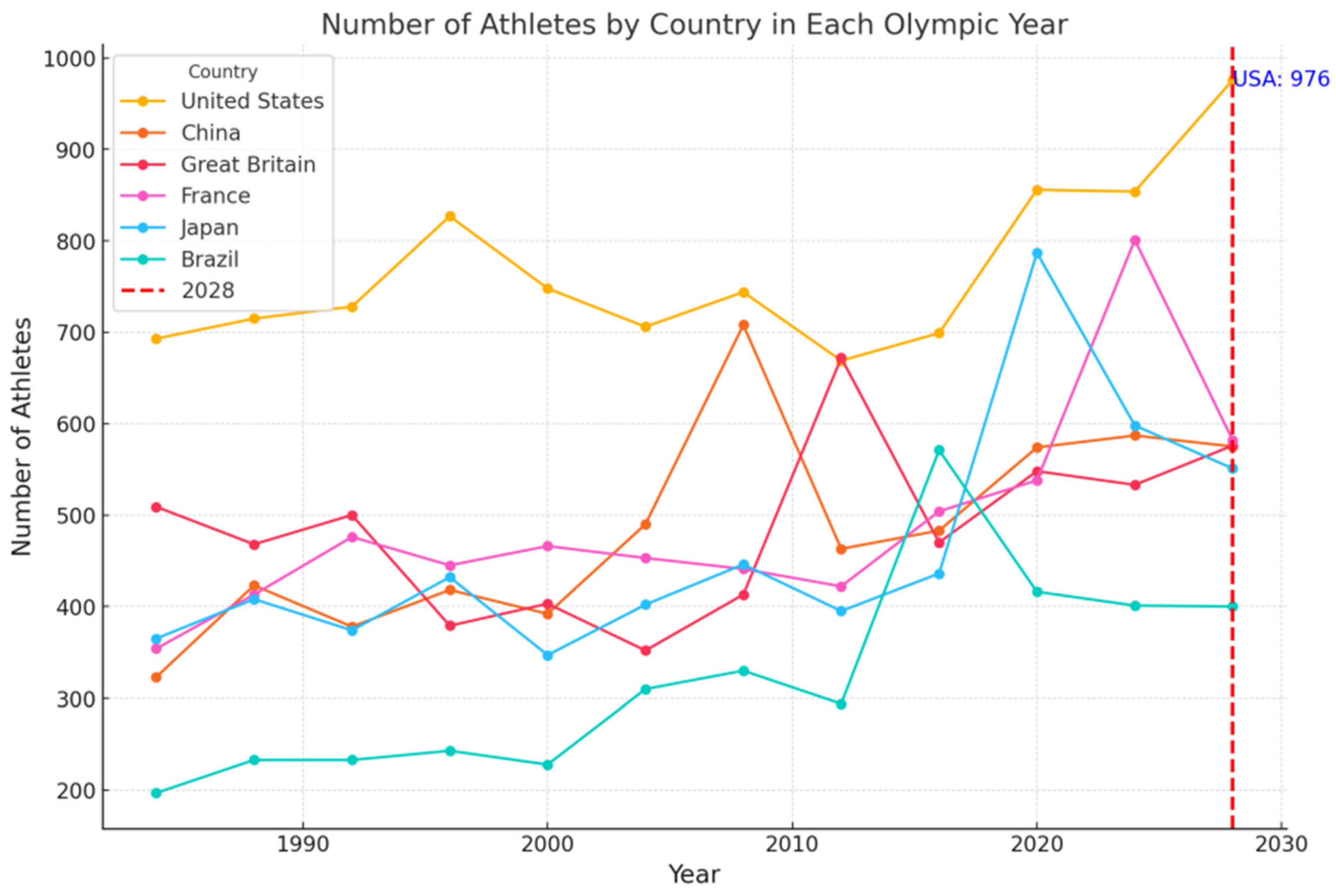From a modeling perspective, this introduces a layer of systematic prediction error. If our model projects future medal counts based solely on historical athletes’ performance and macro indicators (e.g., GDP, population, and past medals), it may overestimate medal counts for countries like China by failing to account for the removal of beneficial events such as karate. Similarly, the model may underestimate France’s performance in 2024 if it does not incorporate the introduction or reinforcement of events in which the host country has a historical advantage (e.g., fencing, breaking, and sport climbing).