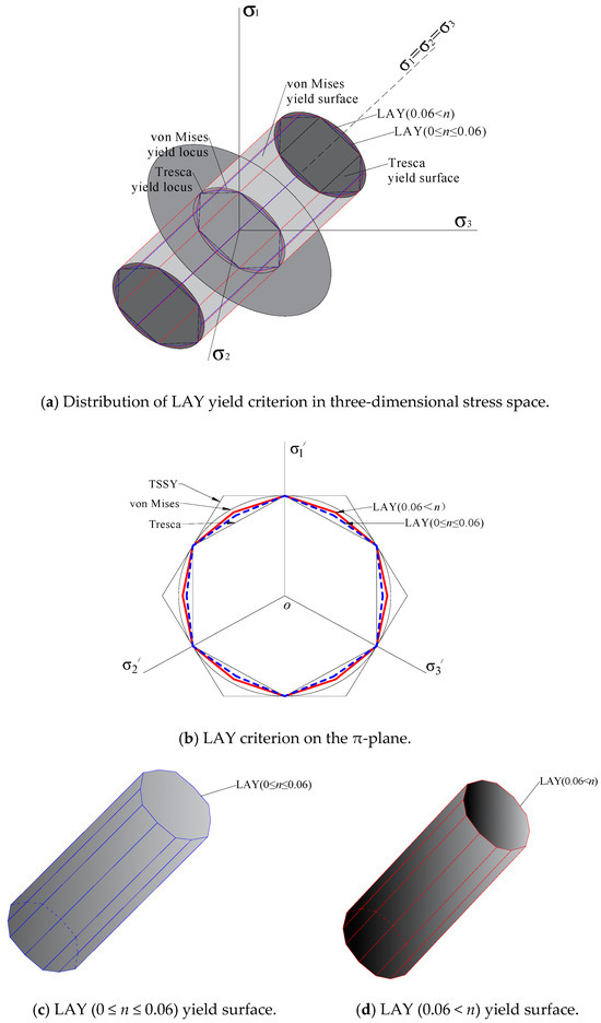 According to Table 1, the difference in the plastic work rate between LAY (0 ≤ n ≤ 0.06) and the Tresca yield criteria is Δ = (1/1.928 − 1/2.000)/(1/1.928) = 3.6%; the difference compared to the ASSY yield criterion is Δ = (1/1.928 − 1/1.856)/(1/1.928) = −3.8%; the difference compared to the von Mises yield criterion is Δ = (1/1.928 − 1/1.732)/(1/1.928) = −11.3%. It can be seen that as 0 ≤ n ≤ 0.06, the LAY yield criterion is in an intermediate state between the Tresca and the ASSY yield criteria. This criterion compensates for the shortcomings of the lower projected results of the Tresca yield criterion and the higher projected results of the ASSY yield criterion.
