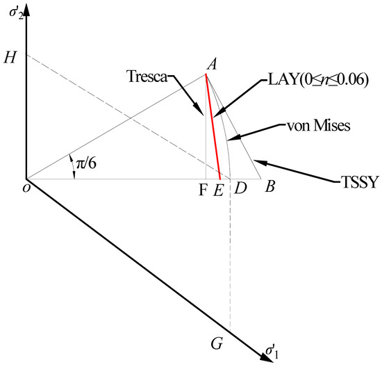 By substituting the stress values of σ1, σ2 and σ3 into the von Mises yield function, , indicating that point D is in a yielding state. Taking the LAY (0 ≤ n ≤ 0.06) criterion as an example, the D-point stress is introduced into the LAY yield function, . This indicates that the stress condition at point D has yielded, based on the LAY criterion, and the critical yield position E should be on the inner side of point D. The ED distance is determined by the projection size of the disparity between two yield functions, so the exact position of point E is