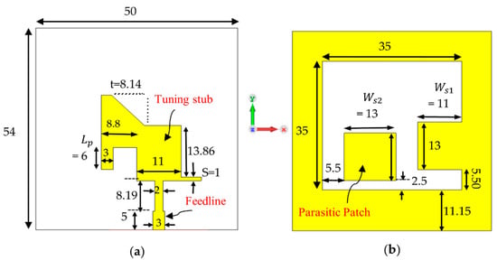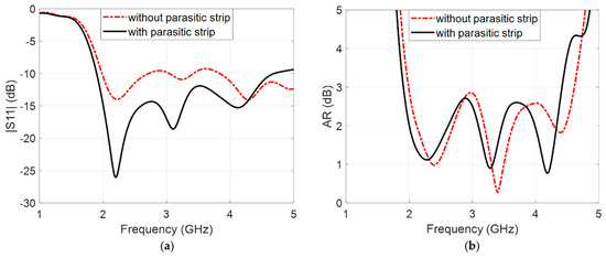 Figure 4 shows the position of the parasitic strip on the slotted ground plane with respect to the tuning stub. To explain the importance of adding this strip in terms of the and AR, Figure 5a and Figure 5b, respectively, depict the simulation results with and without the parasitic strip. It is clear from Figure 5a,b that the parasitic patch has an enormous effect on the impedance BW and a very subtle effect on the ARBW. The reason behind this is that the parasitic patch improves the coupling between the feedline and the radiating slot without modifying the current direction or the phase angle. The location of the rectangular parasitic patch is chosen behind the rectangular tuning stub, and its shape follows the original shape of the stub. The location is also selected in such a way that it does not overlap with the ground plane to improve the coupling between the feedline and the slot.