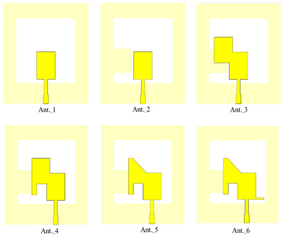 The design procedure for the proposed antenna is illustrated in Figure 2, which follows (Ant. 1–Ant. 6) to reach the final structure. The simulation results of the reflection coefficient () and the broadside axial ratio (AR) of each antenna structure are demonstrated in Figure 3a and Figure 3b, respectively. Ant. 1 is comprised of a conventional wide-slot antenna with a rectangular tuning stub fed by a microstrip line. The length of the slot (L) is approximately equal to half the guided wavelength corresponding to the resonant frequency (2.2 GHz) L ≅ , where the guided wavelength is given by = λ/, λ is the free-space wavelength corresponding to the resonant frequency (2.2 GHz), and is the dielectric constant of the substrate. The impedance BW in this step is equal to 1.39 GHz and resonates at 2.3 GHz, while the AR value is much greater than 3 dB, which does not appear in the figure. In other words, there is no circular polarization in this case. A horizontal rectangular stub with a width of is protruded from the left side of the radiating slot in Ant. 2, which shifts the resonant frequency to 2.15 GHz with a narrow impedance BW of 510 MHz due to the increase in the surface current path around the radiating slot, while the AR appears less than 3 dB because two orthogonal fields are generated. The specific shape and dimensions of the rectangular stub in Ant. 2 were determined through parametric studies aimed at optimizing the axial ratio performance. Although the geometry of the parasitic element is novel, the approach is based on previous studies working on CP antennas. For instance, studies have demonstrated that incorporating parasitic elements can significantly enhance the circular polarization characteristics by introducing additional orthogonal resonances that lead to attaining low AR values [26]. Thereby, this antenna provides CP with a narrow ARBW of 960 MHz. In Ant. 3, a rectangular strip is integrated into the edge of the tuning stub, which enhances the horizontal path of the current, and the AR has been improved significantly to extend along the range (1.9–4.4 GHz) with an ARBW of 2.5 GHz. Meanwhile, the impedance matching of the antenna is lost because the coupling between the feedline and the radiating slot has deteriorated. The mismatch in the impedance is reduced in Ant. 4. It shows that the tuning stub and feedline are translated to the right to add an additional resonant frequency. In addition to this, a vertical strip with a length of is placed on the tuning stub to obtain an impedance BW of 810 MHz from 1.86 to 2.67 GHz. Ant. 4 just improves the impedance matching that was lost in Ant. 3. By cutting the upper corner of the tuning stub, Ant. 5 provides better performance for impedance matching than Ant. 4. The ARBW extends along a wide range from 1.96 to 4.64 GHz because this tapering tunes both the horizontal and vertical current components in such a way that generates two orthogonal equal magnitude components. Finally, Ant. 6 is presented to tune the coupling between the feedline and radiating slot to obtain a wideband impedance BW and ARBW by adding the rectangular parasitic patch to the slotted ground directly behind the tuning stub and attaching the horizontal strip to the tuning stub. The resulting structure provides an impedance BW of 2.8 GHz (1.90–4.7 GHz) and a 3-dB ARBW of 2.52 GHz along the range (1.90–4.42 GHz). Specifically, the work in [33] stated that a combination of a symmetrical slot length and a rectangular parasitic patch successfully enhanced the 3 dB ARBW.