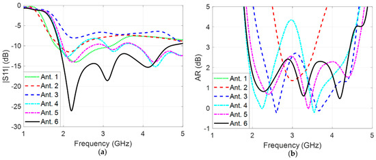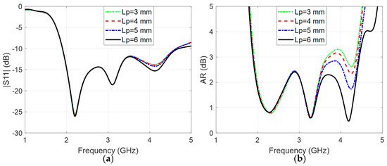 The effect of the length of the vertical strip is exhibited in Figure 8. As can be seen from Figure 8a, the different values of slightly impact the coupling in the impedance matching at 4.2 GHz, while they have no effect in the lower band. The reason for this is that the tuning stub does not contribute in the radiation of the antenna, and it does not control the radiating current path. For the same reason, the mismatching at the upper frequency band of the ARs can be decreased by tuning as in Figure 8b. It extends the CP bandwidth to the highest frequency band when its optimum value of 6 mm is attained.