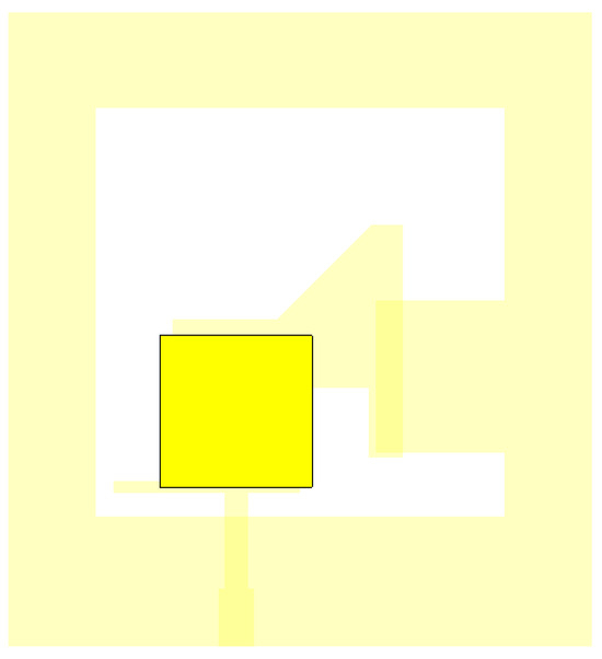 The geometry of the proposed wide-slot antenna is exhibited in Figure 1. The antenna is etched on an FR4 substrate with a dielectric constant of = 4.3, height of h = 1.6 mm, and loss tangent of tan = 0.025. The overall dimensions of this antenna are 54 × 50 × 1.6 mm3, which is equivalent to 0.39λ × 0.36λ × 0.0117λ, where λ is the free-space wavelength corresponding to the lowest resonant frequency. The tuning stub of the antenna is fed by using a 50 Ω microstrip feedline, while the ground plane is engraved as a square slot on the bottom surface of the dielectric substrate. To obtain good coupling and achieve wideband CP, modified strips and stubs are added to the tuning stub and the wide slot. All the key parameters that improve the CP performance are studied in Section 5. Simulated results of the proposed antenna are acquired by using the CST Microwave Studio Suite.