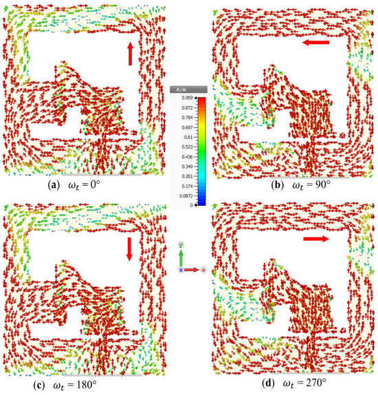 Simulated current distribution of the proposed antenna at 2.2 GHz at different time instants. (a) = 0°; (b) = 90°; (c) = 180°; (d) = 270°.