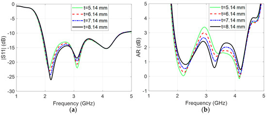 Simulation results of the proposed antenna with = 11 mm, = 6 mm, = 13 mm, S = 1 mm, and different values of t: (a) reflection coefficient and (b) AR.