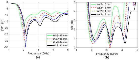 Figure 11 illustrates the effect of changing the width of the horizontal strip attached to the tuning stub on the and AR. Since it is a part of the tuning stub, the impedance matching is extended to the upper side of the frequency as S decreases. Meanwhile, it contributes to obtaining a wide ARBW at the higher frequency band by reducing the mismatching at 3.7 GHz to reach its optimum value of 1 mm. The effect of the width of the horizontal strip (S) appears for values larger than 1 mm because it generates a vertical current component that distorts the orthogonality of the orthogonal current paths.