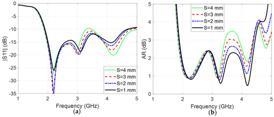 Simulation results of the proposed antenna with = 11 mm, = 6 mm, t = 8.14 mm, = 13 mm, and different values of S: (a) reflection coefficient and (b) AR.
