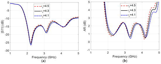 It is known that FR4 introduces higher dielectric losses at frequencies above 3 GHz, which can impact the radiation efficiency and bandwidth. This effect was considered during the design, and the antenna dimensions were optimized accordingly to achieve acceptable performance within the target frequency band. Future work could involve the substrate optimization by replacing FR4 with low-loss dielectric materials such as Rogers RO4003C, RO4350B, or RT/Duroid 5880, which offer significantly lower loss and more stable dielectric constants to improve the bandwidth and gain. Additionally, adaptive metamaterials could be used to adjust the antenna characteristics, offering enhanced reconfigurability and performance. To evaluate the robustness of the antenna performance to manufacturing variations in the dielectric constant of the FR4 substrate, a parametric sweep of 4.1, 4.3, and 4.5 was performed. The results indicate that there is a minor impact on the impedance bandwidth and axial ratio bandwidth. This analysis confirms that the design is tolerant of typical material variations, and FR4 remains a practical choice considering the cost, availability, and fabrication constraints. It is worth noting that this analysis was included for completeness, although the dielectric constant of FR4 is generally well characterized and its impact on performance is well understood in the literature. Figure 12 shows the sensitivity analysis of the variations on the reflection coefficient and axial ratio.