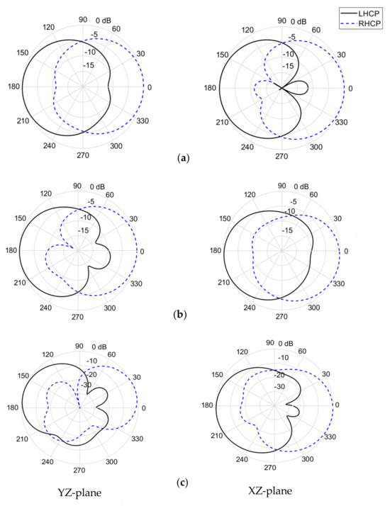 Simulated LHCP and RHCP patterns of the proposed antenna at (a) f = 2.2 GHz, (b) f = 3.1 GHz, and (c) f = 4.2 GHz.