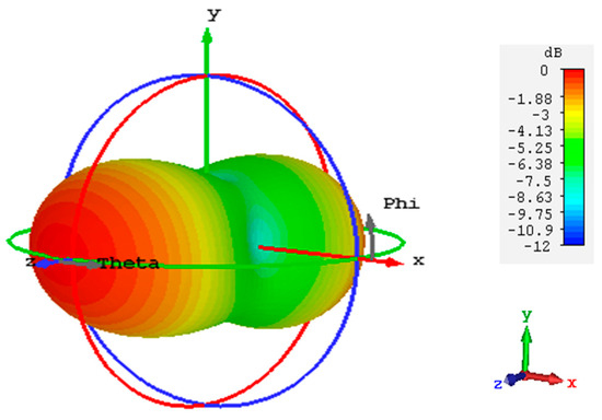 The simulated 3D normalized power pattern of the proposed antenna is demonstrated in Figure 14 at the resonant frequency of 2.2 GHz. This pattern provides a comprehensive view of the antenna’s radiation behavior in space and is essential for evaluating its directional characteristics and overall radiation performance.