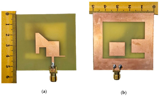 There are different methods for designing antennas with CP, depending on the applications for which they are intended. Narrow-band CP antennas were proposed in [3,4,5]. Some dual-band antennas were designed by using an asymmetrical slot [6], a slot antenna with a parallel split-ring resonator [7], and stacked patches with reactive impedance surfaces for ISM and WiMax applications [8]. Multiband CP antennas were generated in [9,10] by using a Minkowski fractal slot for many frequency bands [9], and a multiband ultra-high-frequency (UHF) antenna for RFID applications was presented in [10]. To generate wideband dual CP antennas, aperture-coupled stack patches were designed in [11]. The patches are fed by a hybrid coupler to obtain an axial ratio bandwidth (ARBW) of 29.1% extended along the range (4.7–6.3 GHz). In [12,13], MIMO antennas were proposed. A four-element MIMO G-shaped monopole antenna was presented as a dual CP with an ARBW of 67.7% [12]. A wideband CP monopole antenna was proposed by using a co-planar waveguide (CPW)-fed approach [14,15]. Broadband C-shaped CP monopole antennas were presented in [16,17,18]. In [19], a cross-shaped monopole antenna was designed to obtain an ARBW of 42.6%. Recently, a 2 × 2 metasurface antenna array was proposed in [20] by using nonuniform slots to improve the ARBW to 61.75%.