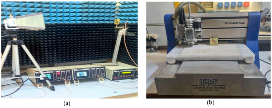 (a) The measurement setup of the radiation pattern, AR, and gain, and the (b) LPKF CNC machine.