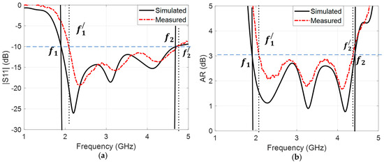 The simulated and measured results of the and Ars are demonstrated in Figure 17a and Figure 17b, respectively. The BW is calculated based on (, for simulated results) and (, for measured results), which are marked in the figure. These frequencies represent the lower and upper cutoff frequencies, respectively, where the BW criterion is satisfied (|| < −10 dB and AR < 3 dB). The simulated −10 dB impedance BW is equal to 2.8 GHz (85%) along the range (1.90–4.7 GHz), while the measured −10 dB impedance BW is 2.65 GHz (78%) (from 2.08 to 4.73 GHz). On the other hand, the simulated 3 dB ARBW is 2.52 GHz (80%) extending along the range (1.90–4.42 GHz), whereas the measured 3 dB ARBW is equal to 2.31 GHz (71.6%) over the frequency range (2.07–4.38 GHz). The difference between the simulated and measured results can be attributed to several factors. These factors include fabrication tolerances and imperfections in the SMA connector soldering. The measurement setup limitations includereflections from nearby equipment inside the anechoic chamber or cable losses. Additionally, parasitic effects of the SMA connector can lead to an impedance mismatch, causing a slight shift in the resonance frequency. Moreover, substrate moisture absorption, especially in FR4 materials, may increase the effective dielectric constant, resulting in a lower resonant frequency and reduced bandwidth.