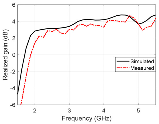 Simulated and measured realized gain of the proposed antenna as a function of the frequency.