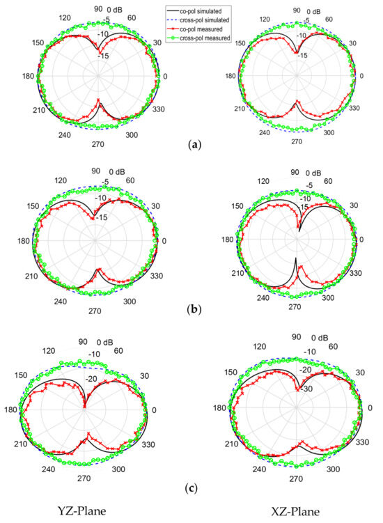 The simulated and measured co-polarized and cross-polarized radiation patterns of the proposed antenna are presented in Figure 19 at the YZ- and XZ-planes at the three resonant frequencies. The evidence of the presence of CP in the broadside direction () is that the co- and cross-polarization radiation patterns are close to each other with a difference of less than 3 dB between them for both planes at this direction of propagation.