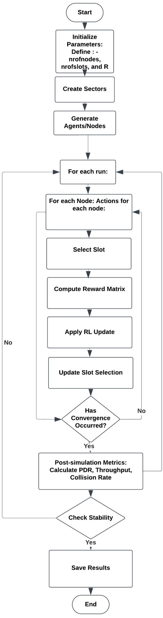 Figure 4 illustrates the workflow of the RL-based slot allocation protocol’s (RL-SCAP) mechanisms for a clearer understanding of how the protocol works. The process starts by initializing important parameters, such as the network radius (R), number of slots (nrofslots), and number of nodes (nrofnodes). The system generates sectors and agents or nodes within them. After that, the process goes into a loop, where the simulation is performed several times. Each node performs actions in each episode of each run by choosing a slot, applying a reinforcement learning update, calculating a reward matrix depending on performance, and modifying its slot selection accordingly. This iterative process continues until convergence is reached. Post-simulation parameters, including collision rate, throughput, and packet delivery ratio (PDR) are computed after convergence. After verifying that the results are stable, the system saves them if the stability requirements are satisfied. The workflow then comes to an end, monitoring stability and important performance parameters while using reinforcement learning to ensure an optimal slot allocation method.