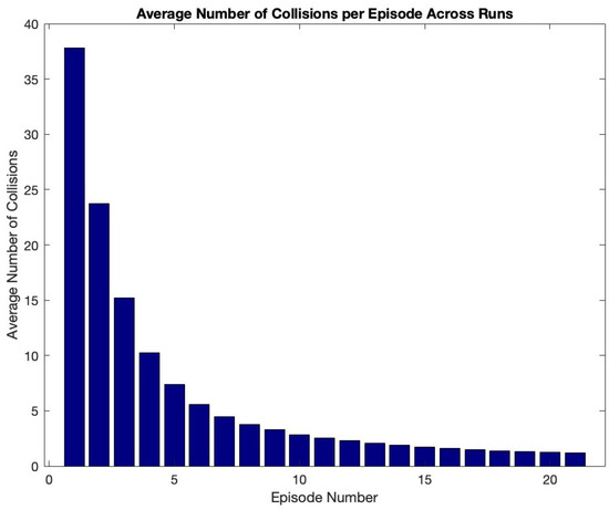 To evaluate the impact of different reward value sets on the performance of our reinforcement learning algorithm, we conducted a sensitivity analysis by testing several decreasing reward configurations. Specifically, we compared the baseline reward set with three alternative sets: [30, 20, 15, 10, 5], [25, 18, 12, 7, 3], and [40, 15, 6, 2, 0.1]. In each case, we examined the number of collisions and the number of episodes required for convergence, as shown in Figure 6 and Figure 7, respectively. Our findings show that the Q-learning algorithm is not highly sensitive to the exact values of the rewards, provided that the reward values decrease in magnitude. For instance, as shown in Figure 6, the percentage difference in the number of collisions compared with the original reward set was 7.22% for [30, 20, 15, 10, 5], 5.28% for [25, 18, 12, 7, 3], and 6.91% for [40, 15, 6, 2, 0.1], yielding an average deviation of 6.47%. A similar trend was observed in the number of episodes required to reach convergence. As shown in Figure 7, the percentage difference relative to the original set was 10.33% for [30, 20, 15, 10, 5], 7.18% for [25, 18, 12, 7, 3], and 10.01% for [40, 15, 6, 2, 0.1], with an average difference of 9.17%. These results confirm the robustness of our learning framework with respect to reward shaping, as long as the reward structure remains consistently decreasing.