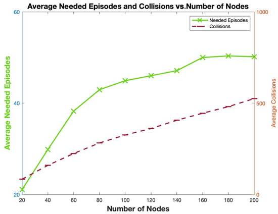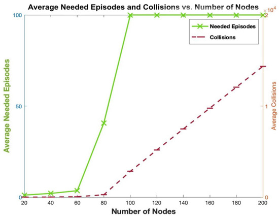 As shown in Figure 8, two behaviors can be noted. The first one is when the number of nodes is less than or equal to the number of available slots (80), there is a gradual increase in the number of collisions and needed episodes until convergence is observed. The second behavior is experienced when the number of nodes is higher than the number of available slots. In this case, an important increase in the number of collisions is experienced between two consecutive values of the number of nodes, as convergence will never be reached. Indeed, when the number of nodes is higher than the number of available slots, mutually exclusive assignment of slots will never be reached; hence, the number of needed episodes is 100, which is the maximum set value in our simulations.