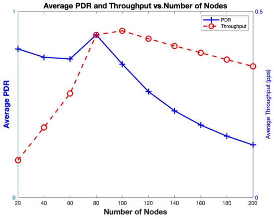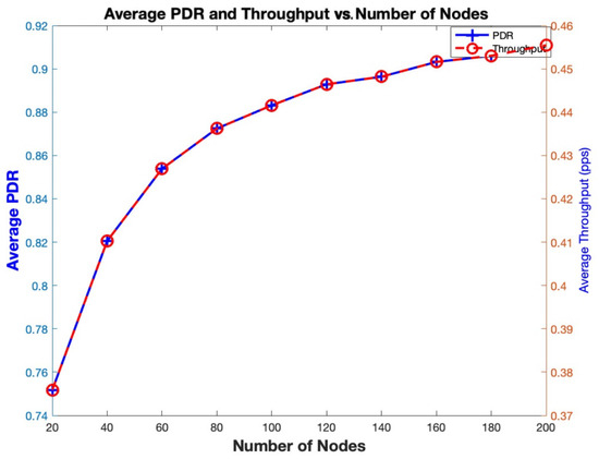 Regarding the PDR, as shown in Figure 9, a local minimum is observed at 60 nodes, while a global maximum occurs at 80 nodes. This behavior is driven, first, by the increasing number of collisions as more nodes compete for limited slots, and second, by the simultaneous rise in the number of transmissions, which temporarily enhances packet delivery. The trade-off between these two factors leads to the formation of local and global optima. After 80 nodes, both PDR and Throughput decline. For instance, when the number of nodes reaches 200 (which is 2.5 times the number of available slots), the PDR drops to approximately 0.88–0.89, while the Throughput stabilizes around 4.5 pps. This confirms that beyond 80 nodes, increased contention negatively impacts PDR, but Throughput remains steady, likely due to a balance between successful transmissions and collisions.