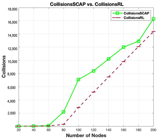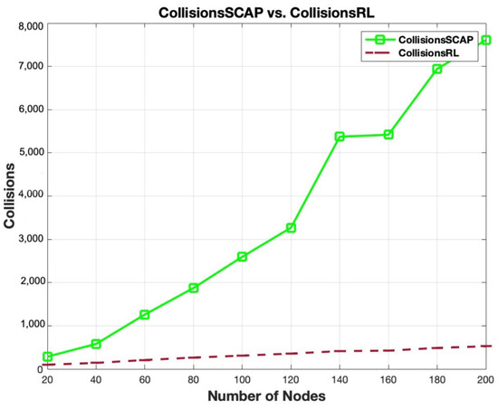 Figure 15 compares the collisions between SCAP and RL-SCAP. As the number of nodes rises, SCAP shows a substantial rise in collisions. When the number of available slots equals the number of nodes, RL-SCAP consistently maintains noticeably lower collision rates. As the number of nodes increases, the difference between SCAP and RL-SCAP becomes wider, suggesting that RL-SCAP scales more effectively. SCAP continues to have significant collision rates despite slots growing proportionally. This implies that the deterministic slot allocation method of SCAP is unable to adjust to the expansion of the network. In contrast, RL-SCAP uses reinforcement learning to allocate slots efficiently, lowering congestion and enhancing network stability. RL-SCAP decreases collisions by an average of 79.37%, with a highest reduction of 80.00%.