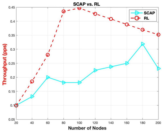 Similar to the PDR, RL-SCAP achieves higher throughput than the SCAP protocol as shown in Figure 14. Despite its low achievement, the throughput of SCAP slowly increases until saturation is reached when the number of nodes equals 180, after which it starts decreasing. Indeed, in the first phase, when the number of nodes is less than 180, the SCAP network succeeds in delivering slightly more packets despite the high increase in collisions as the number of transmissions increases with the number of nodes. In fact, as the throughput is a compromise between the number os transmission attempts and the number of collisions, when the number of nodes is less than 180, the total number of transmissions is greater than the number of collisions. However, after saturation, the number of collisions highly dominates the number of transmission attempts, hence the decrease in throughput.
