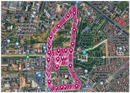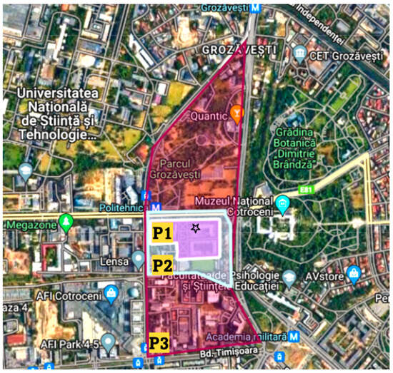 - Step 1: System Design and Technology Selection: The LoRaWAN configuration in this study operates in the EU868 MHz band, utilizing SF7 for high data rate transmission and SF12 for long-range communication. The hardware selection includes Adeunis Class A/C FTDs for RSSI/SNR measurements, configured with Over-The-Air Activation (OTAA) and 14 dBm transmission power, while Dragino LG308-EC25 gateways with LTE backhaul were strategically placed at five building levels (from the ground to the 9th floor). The experiment was conducted over a 6 h continuous operation, divided into three phases (P1, P2, and P3), in the urban area around Politehnica University of Bucharest, as shown in Figure 2. This location was chosen for its diverse architectural styles and urban infrastructure, including closely packed buildings and open areas, providing a comprehensive environment to assess LoRaWAN performance in dense urban settings.
